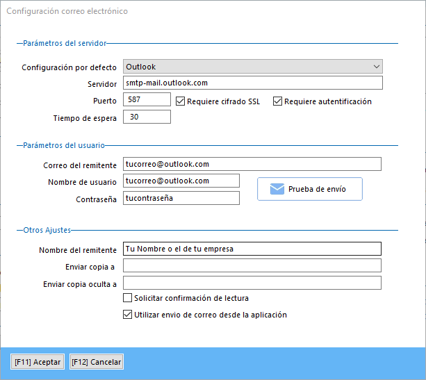 Para enviar correos electrónicos a través de SMTP de Outlook, introduzca la siguiente configuración en la aplicación o el cliente de correo electrónico:
