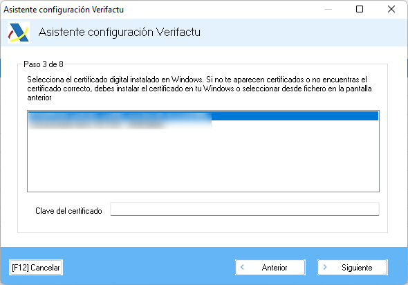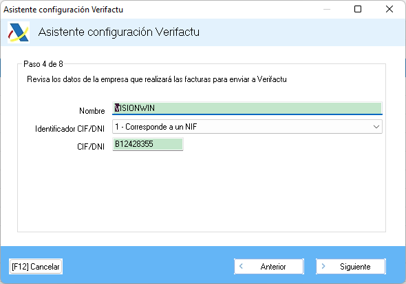 - En la siguiente pantalla revisaremos que el nombre de la empresa y el CIF sean correctos. En el caso de estar bien y el certificado configurado anteriormente es correcto, nos aparecerá en verde: