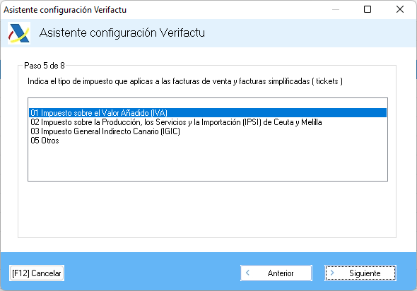 - En la siguiente pantalla le indicaremos la clasificación de IVA que utiliza nuestra empresa para hacer las facturas y tickets ( Facturas simplificadas ). Es importante indicar la clasificación correcta para evitar problemas de rechazo en el envío a Verifactu